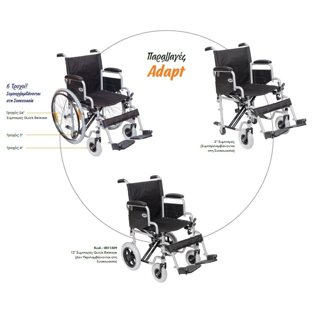 Το Αναπηρικό Αμαξίδιο Adapt Διατίθεται στη Συσκευασία με 6 Τροχούς, Δίνοντας την Επιλογή Αφαίρεσης τωνΠίσω Τροχών με Quick Release, Διευκολύνοντας την Πρόσβαση σε Χώρους, όπου το Πλάτος του Αμαξιδίου δεν το Επιτρέπει.