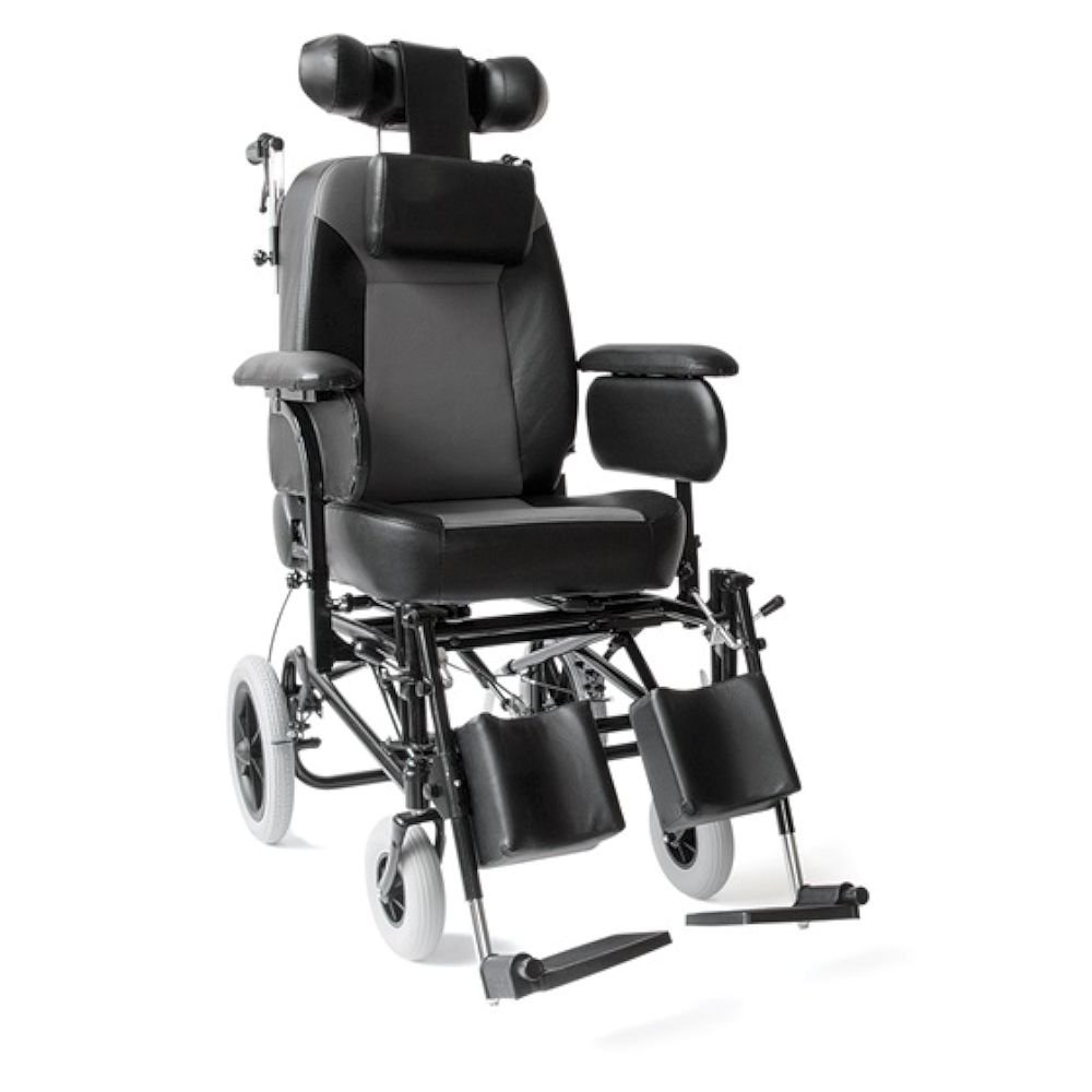 Αναπηρικό Αμαξίδιο ειδικού τύπου με ηλεκτροστατική βαφή (“powder coating”), ανακλινόμενη πλάτη και ρυθμιζόμενο και προσθαφαιρούμενο προσκέφαλο. Διαθέτει ρυθμιζόμενη γωνία καθίσματος, υποβραχιόνια ρυθμιζόμενου ύψους & πλάτους και ανακλινόμενα και προσθαφαιρούμενα υποπόδια. Επιπλέον έχει φρένα συνοδού και στους πίσω τροχούς και μοχλο ρύθμισης της θέσης καθίσματος.