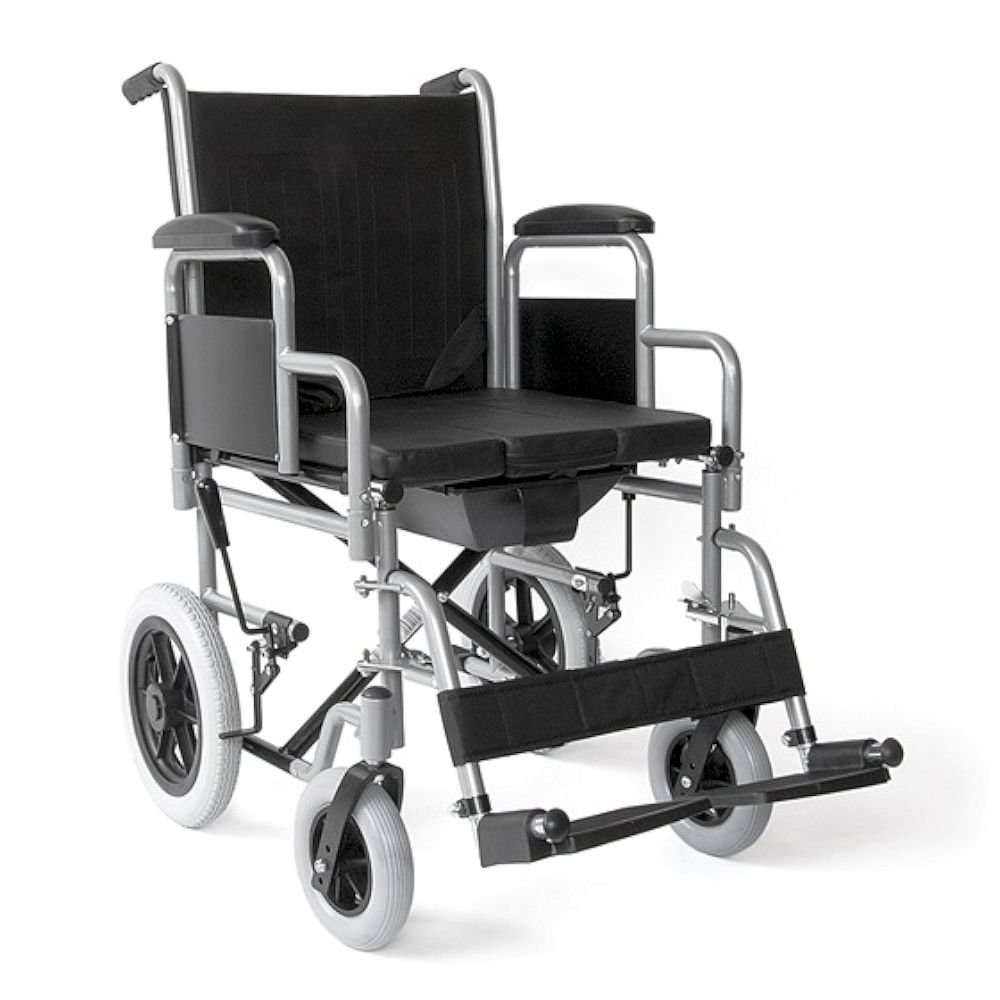 Αναπηρικό Αμαξίδιο μεταλλικό μεταφοράς, πτυσσόμενο με δοχείο WC και προσθαφαιρούμενο κάλυμμα οπής. Διαθέτει κάθισμα από δερματίνη, αφαιρούμενα υποπόδια, ιμάντα στήριξης γάμπας και ζώνη ασφαλείας καθώς και φρένα στις πίσω ρόδες.