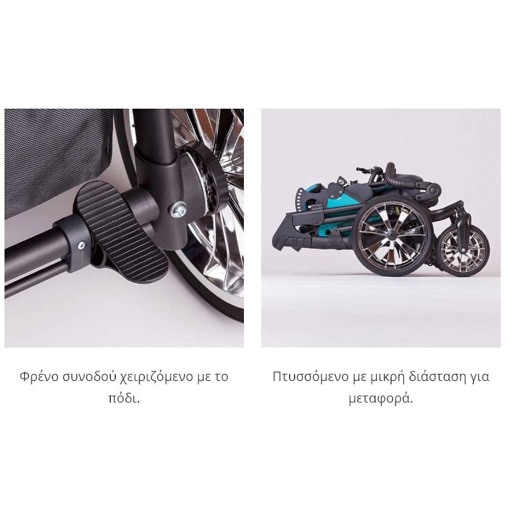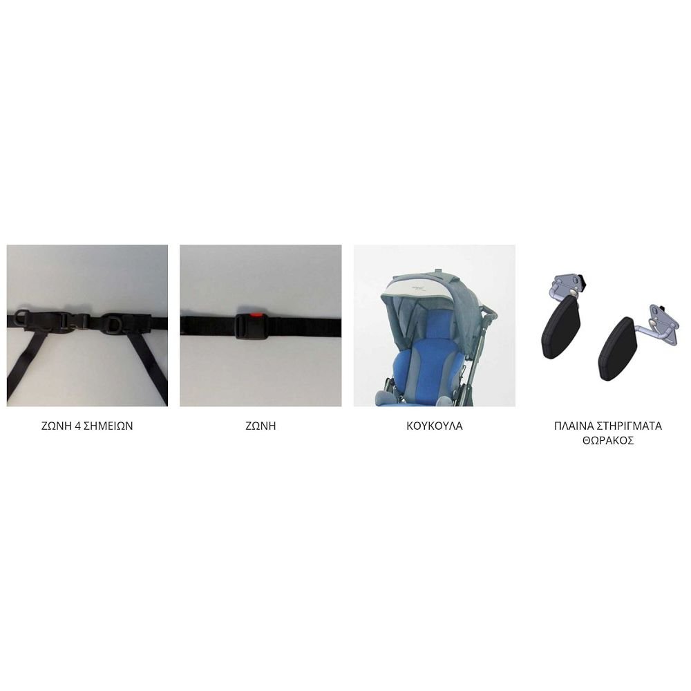Αποτελείτε από: 4τροχη βάση εξωτερικού χώρου, κάθισμα, προσκέφαλο και υποπόδιο.